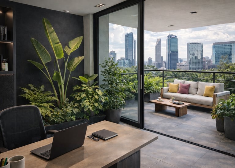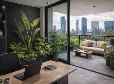 Un espacio verde integrado a la arquitectura urbana, diseñado para aportar frescura, bienestar y una conexión natural dentro del entorno de trabajo.